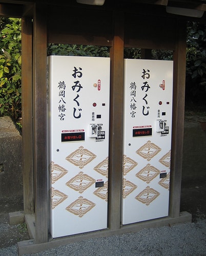 These vending machines are commonly found at temples and shrines. They are small slips of paper that presumably tell your fortune (called “omikuji” in Japan). For good luck, omikujis are traditionally tied to trees or pillars.