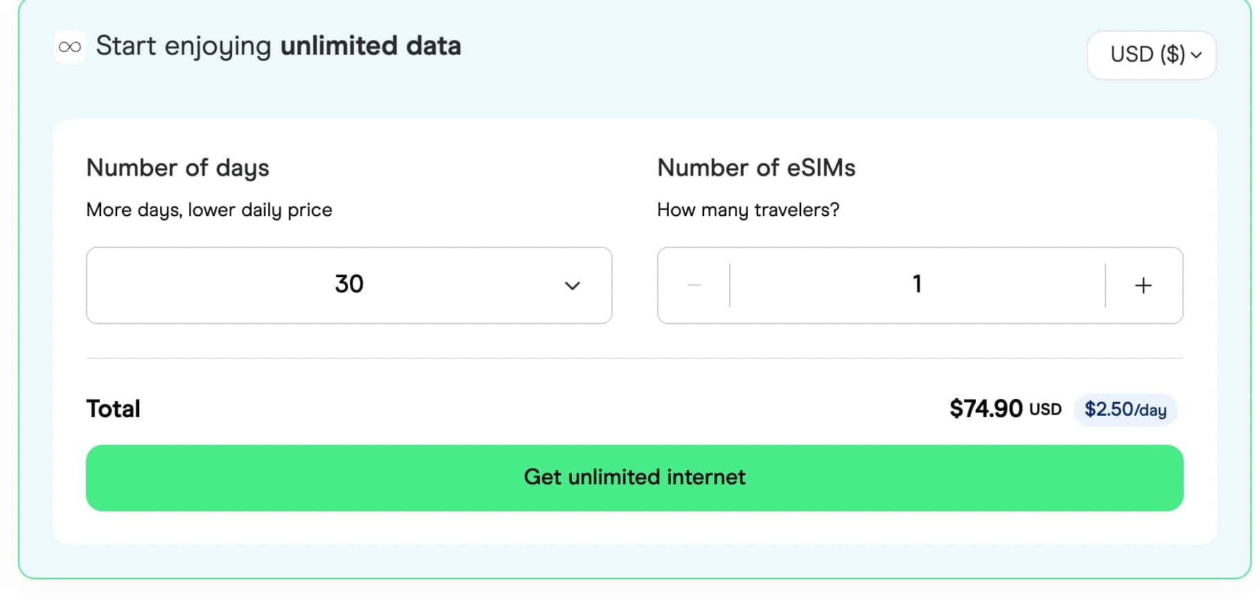 À mon avis, Holafly est une excellente alternative à Airalo pour les forfaits régionaux avec données illimitées en Europe, au Royaume-Uni et aux États-Unis. Ils sont également idéaux pour ceux qui recherchent une eSim pour un pays plus obscur, car ils ont une liste de couverture de pays deux fois supérieure à celle d’Airalo. En général, ils sont plus chers par gigaoctet de données, mais lorsque vous bénéficiez de données illimitées, cela compense. Jetons un coup d’œil à quelques-uns de leurs prix.