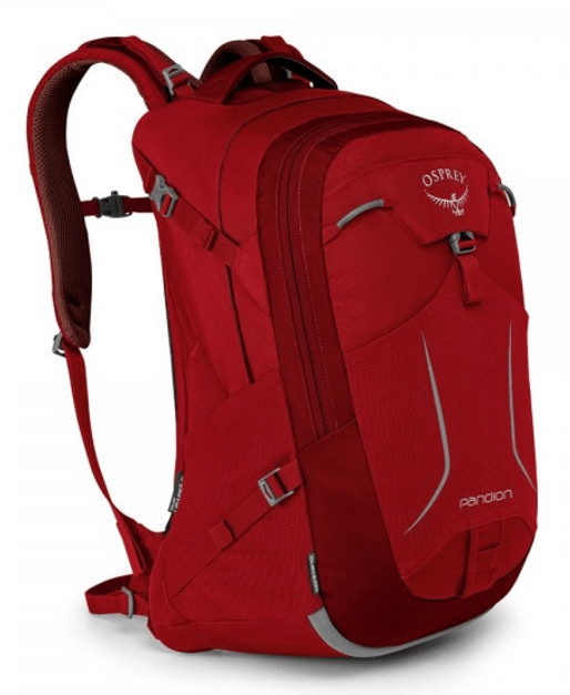 The Osprey Pandion backpack has 5 color options: Black, Armour Gray (with red accents), Red, Blue & Green.